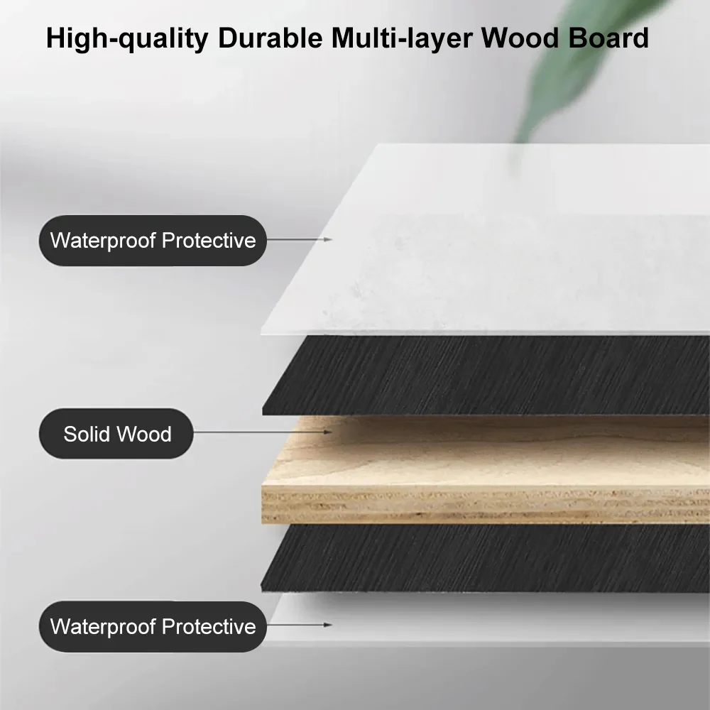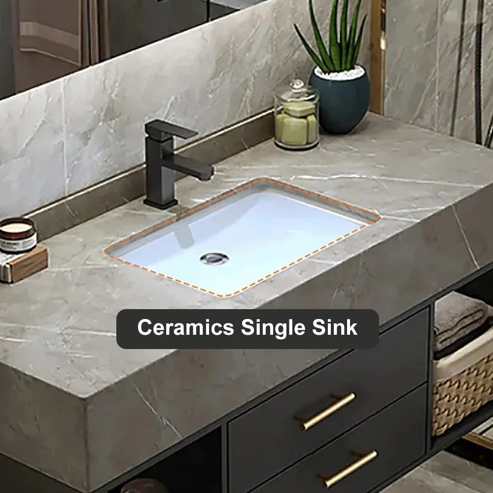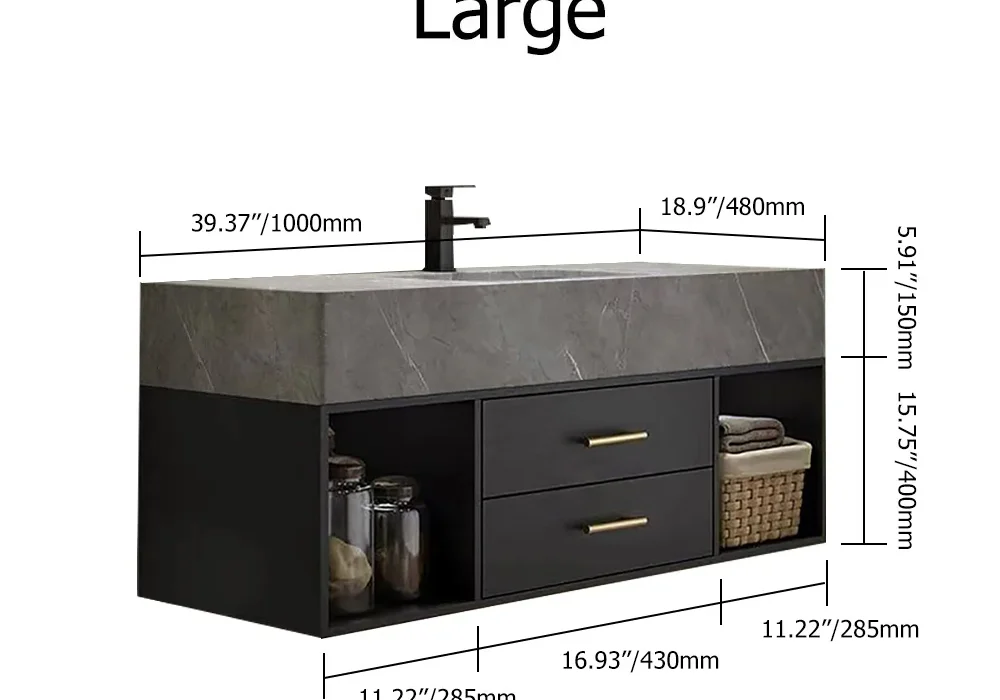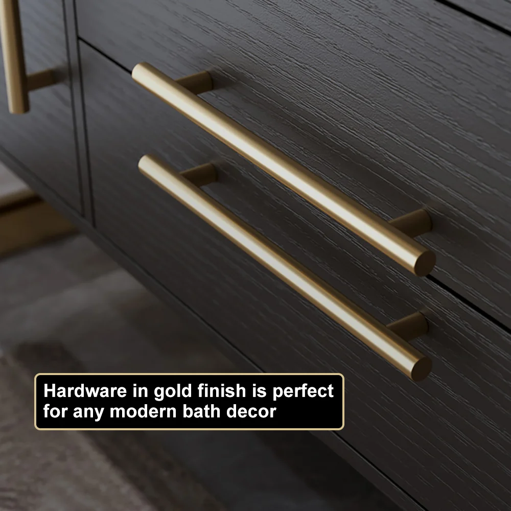 This wall-mounted bathroom vanity elevates your space with its elegant design and practical storage. The stone countertop contrasts with the solid wood base, while the gold-finished metal hardware adds a touch of sophistication.