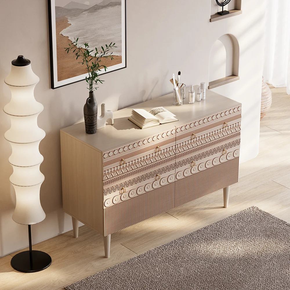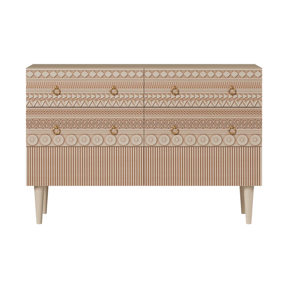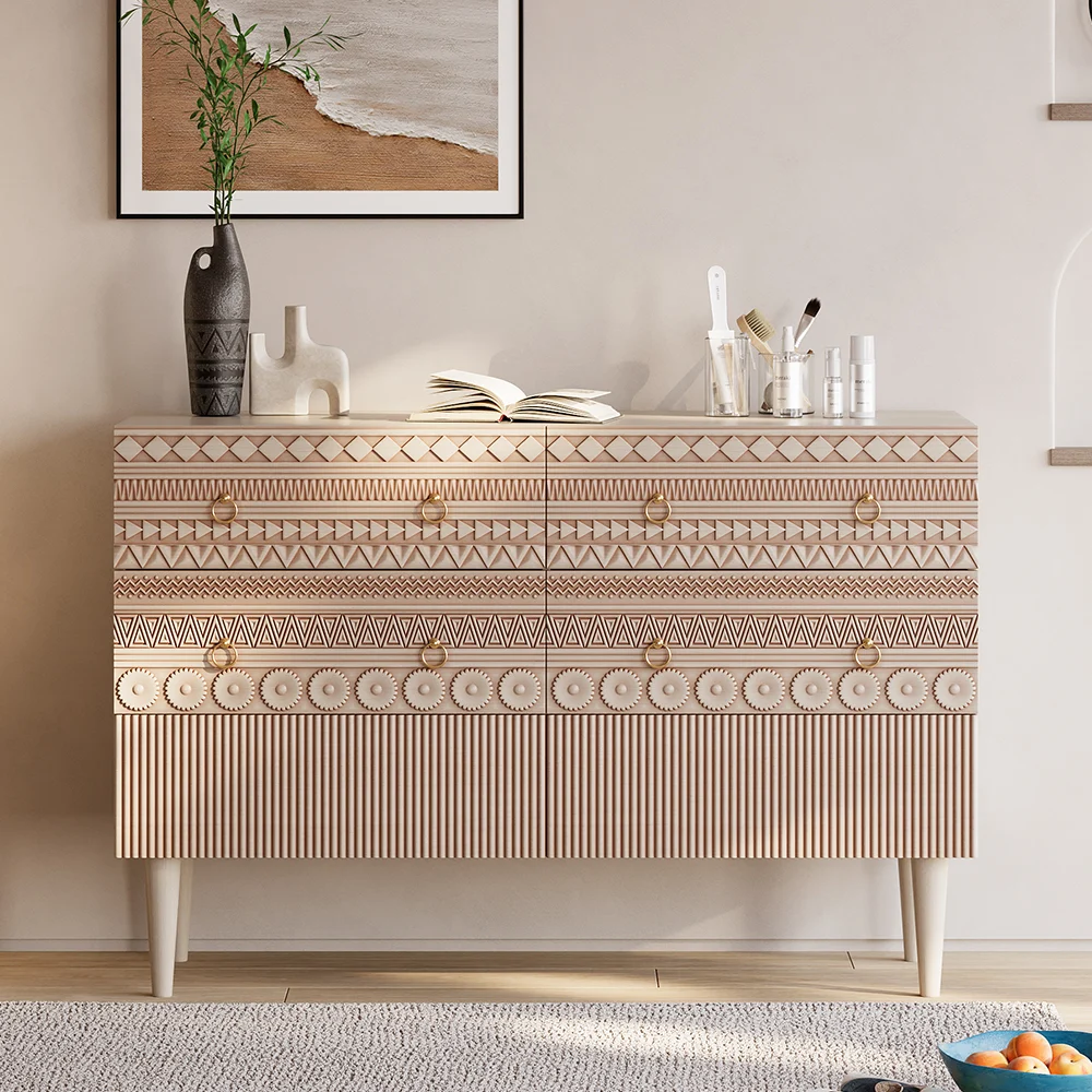 【Boho Bliss】 Carved to perfection, each drawer panel is a testament to the artistry embedded in every bit of this dresser. Run your fingers over the intricate detailing, and let the tactile experience transport you to a world where every piece of furniture tells a story.