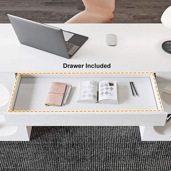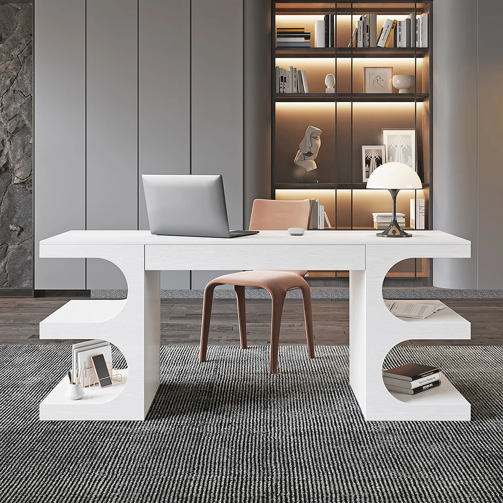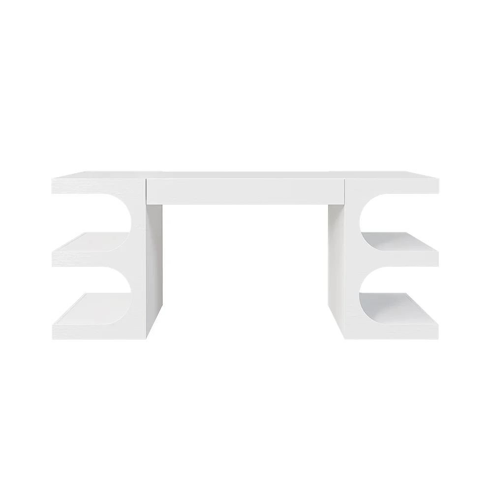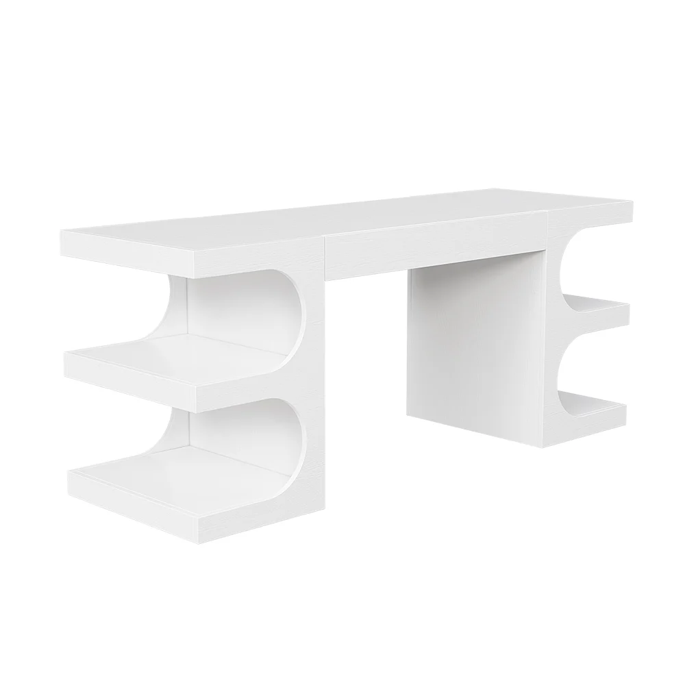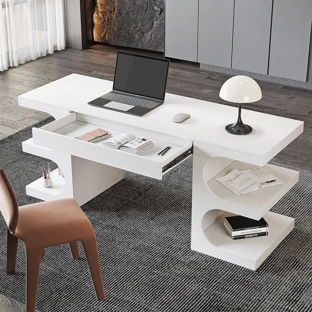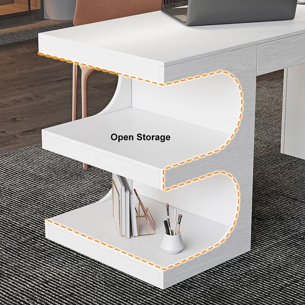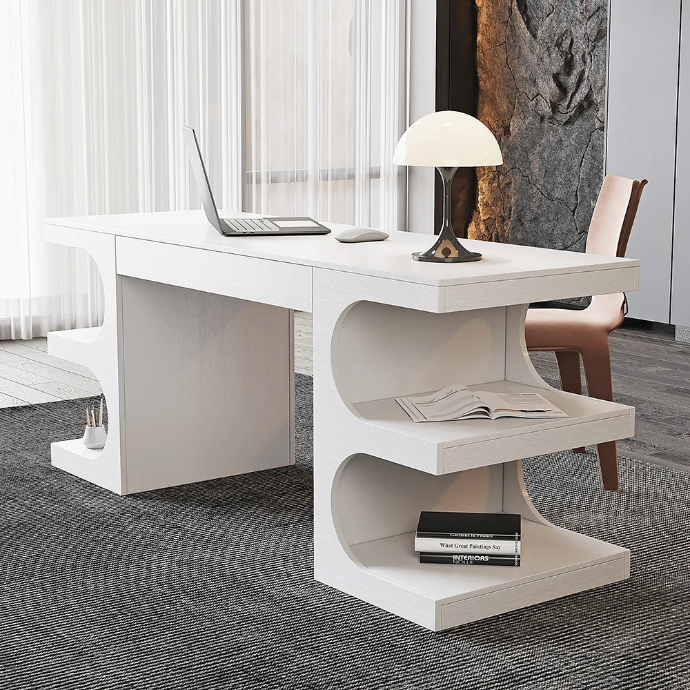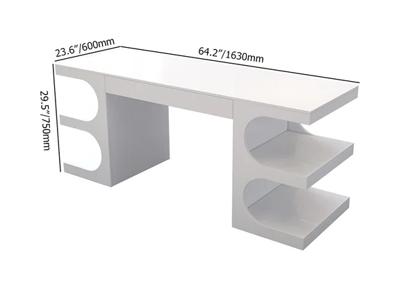 This writing desk is outlined with simple and clean lines with sculptural shape, which can be perfectly integrated into various modern home decoration spaces, especially laidback contemporary appeal. The wide wooden desktop provides ample space for a laptop, monitor, and keyboard, with room for writing, study, or drawing. 4 open storage shelves and 1 drawer give you room for books, equipment, and office supplies, so your desktop stays uncluttered. It’s crafted from white MDF material with wood grain, bringing the feeling with rich texture and touch.