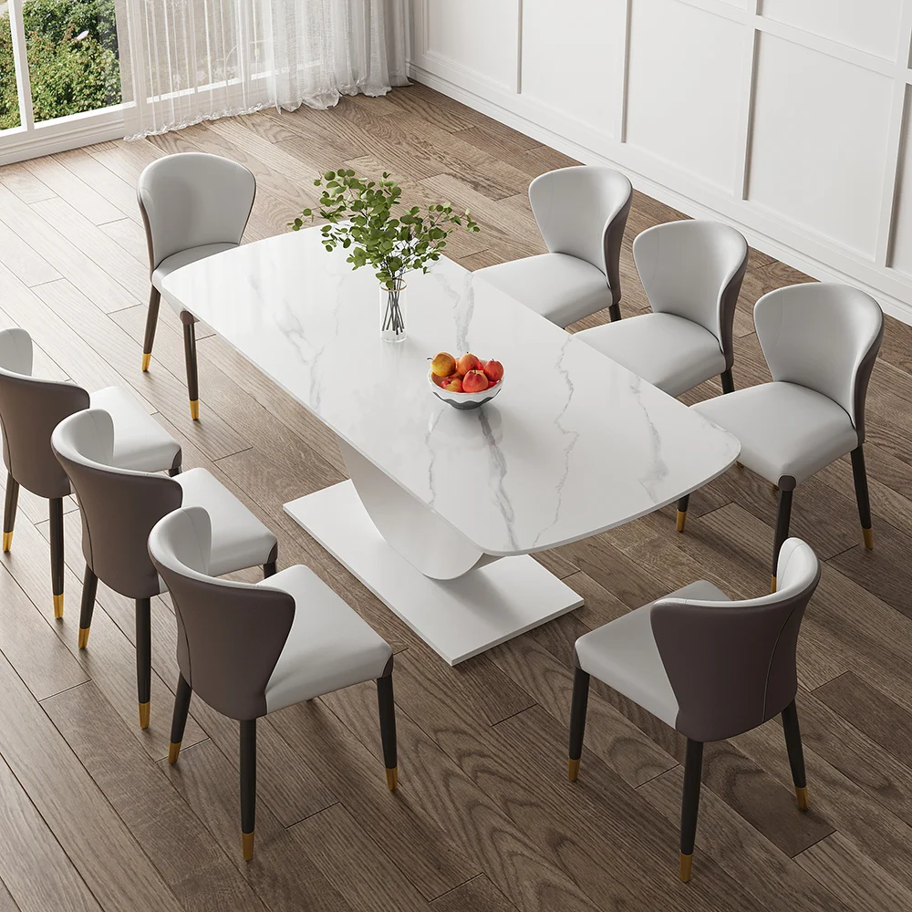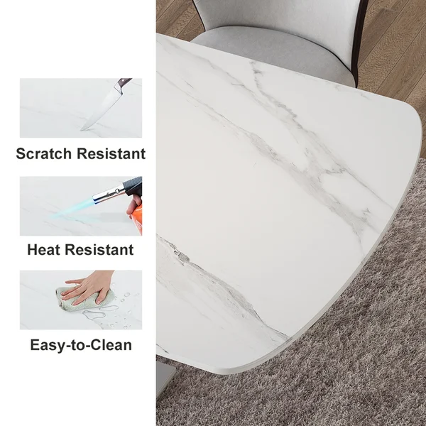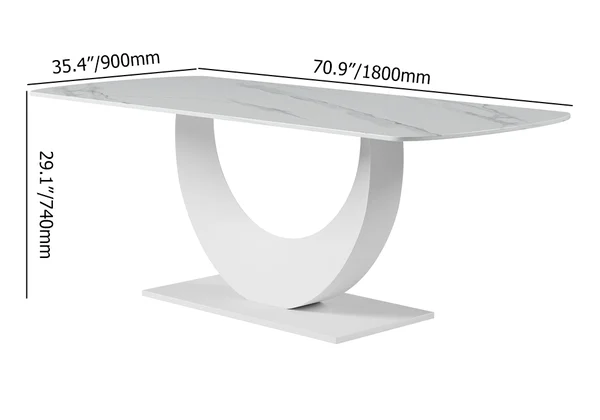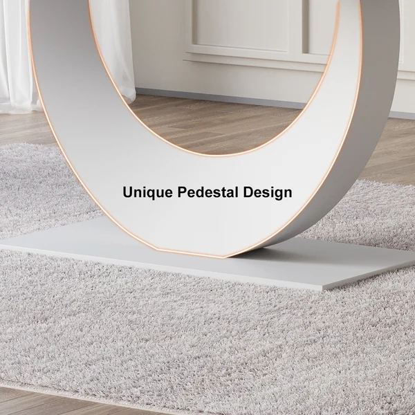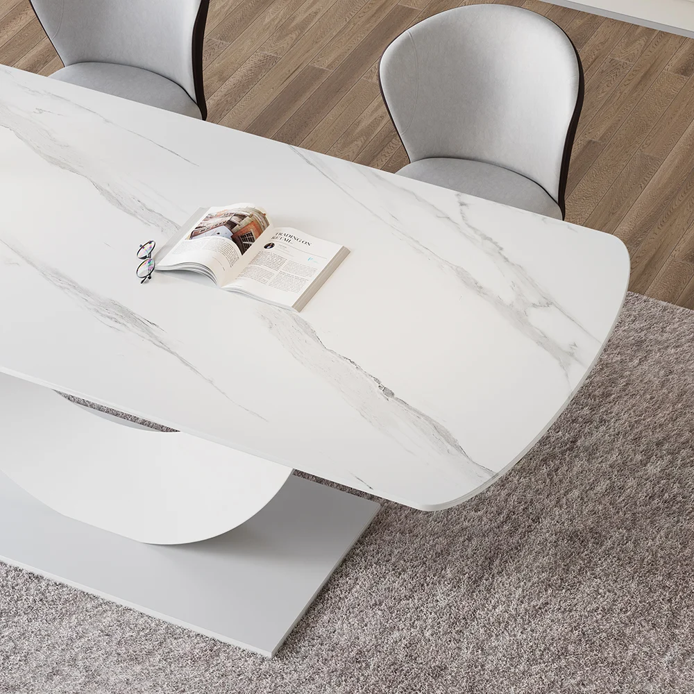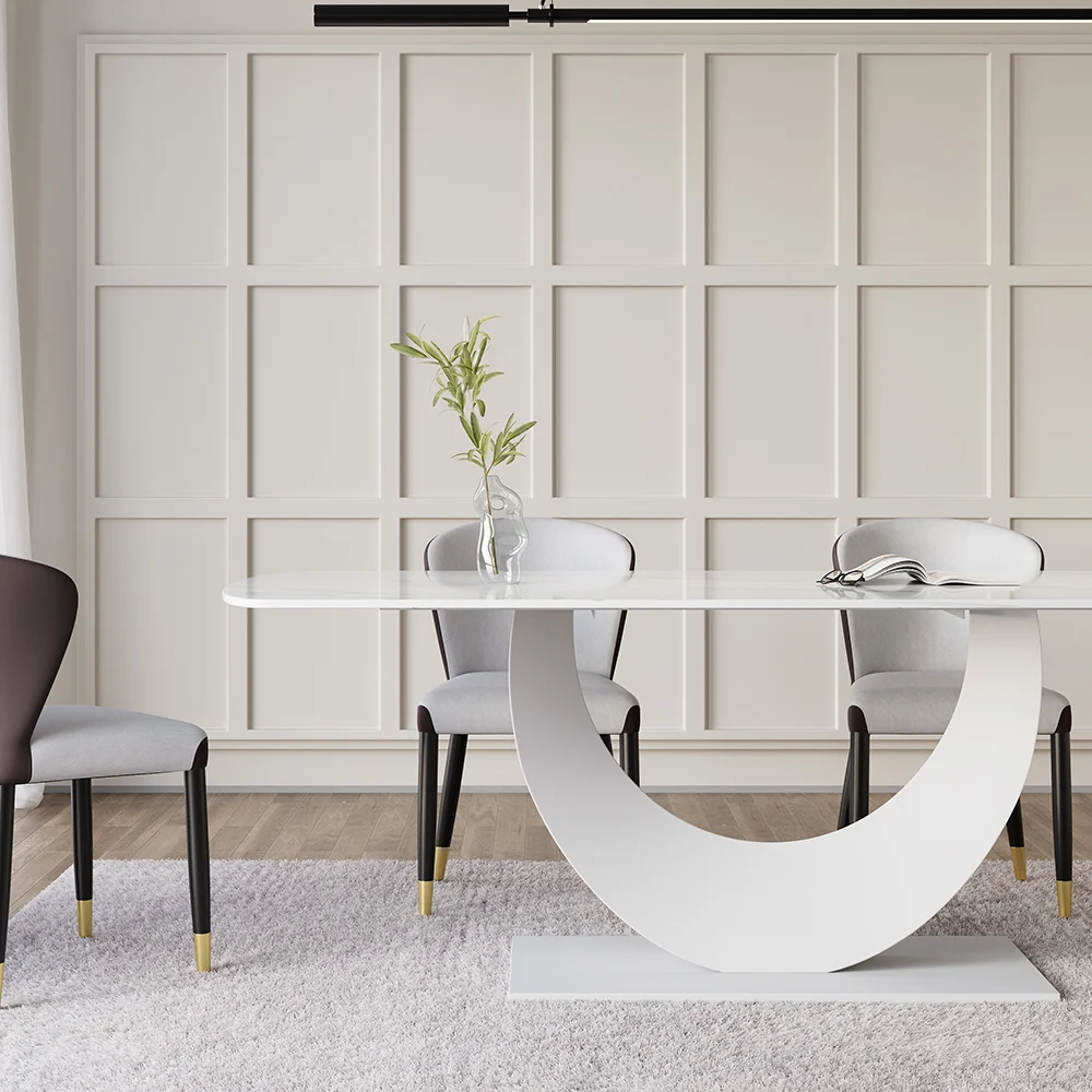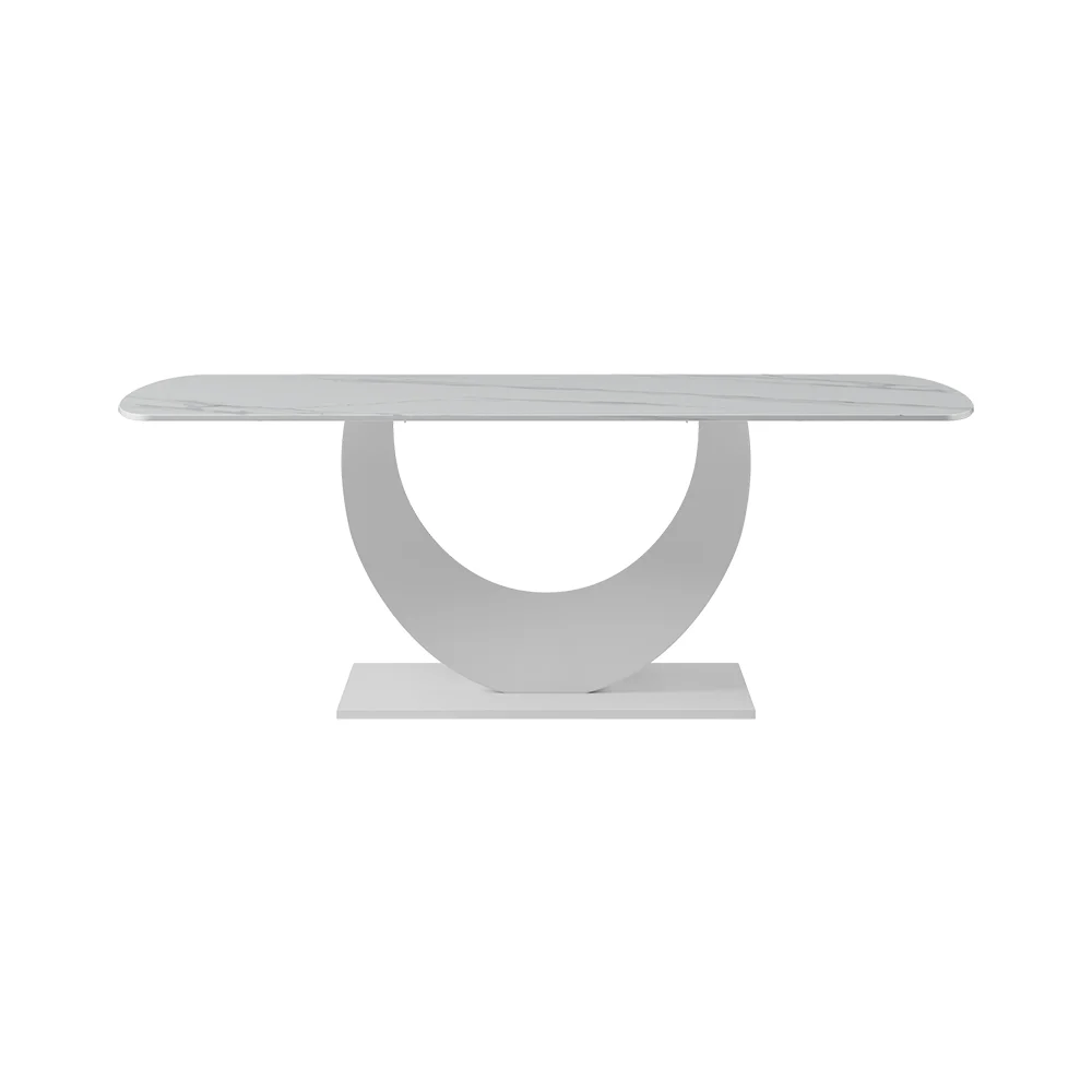 Complement a daily dining space with this modern dining table. The tabletop showcase a smooth finish, which allows easy cleaning while resisting scratches, heat, and fading, keeping the beauty for years to come. Crafted from quality sintered stone and refined metal, it allows long-lasting service. The unique crescent moon design pedestal brings an understated and unique taste to your furnishing.