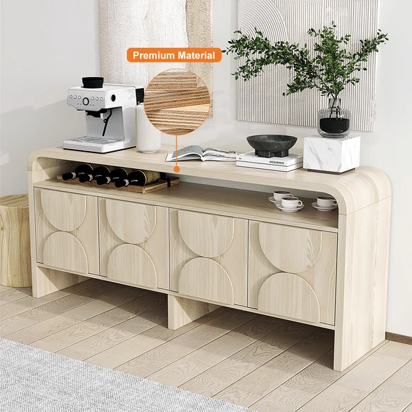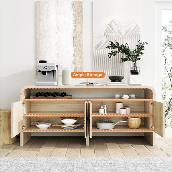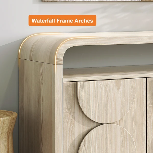 Add a cool, effortless vibe home with this distressed white wood sideboard. A waterfall frame arches just beyond the floating cabinet to create an open shelf for storing small yet necessary items. Four doors open to reveal generous interior storage and two shelves. This credenza is built of fine MDF and high-quality oak veneer and it will give years of service and timeless elegance. Works beautifully in the dining room, bedroom or entry.