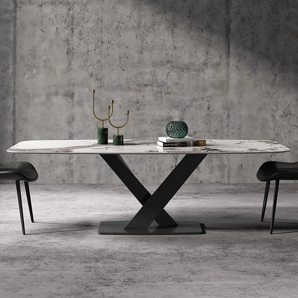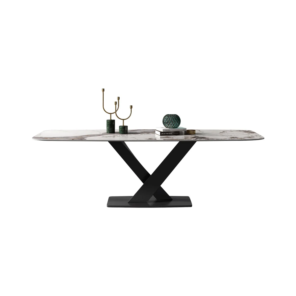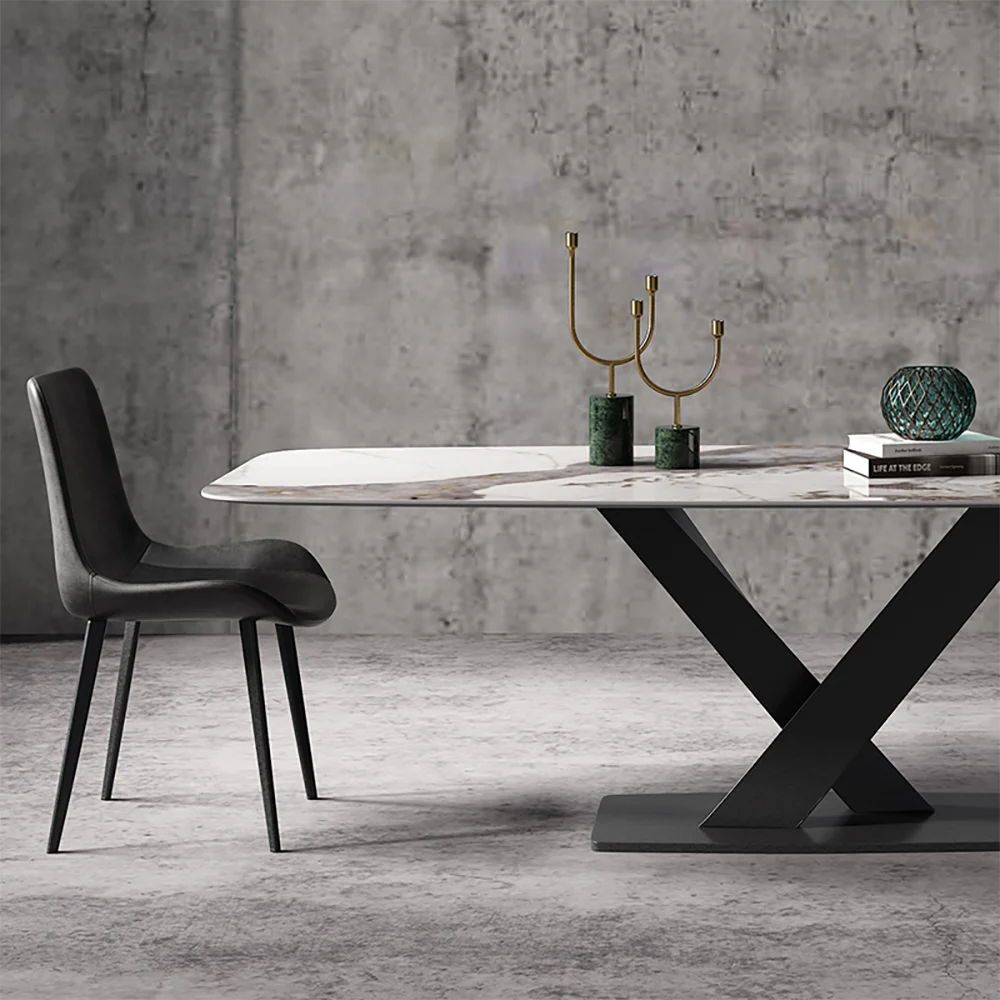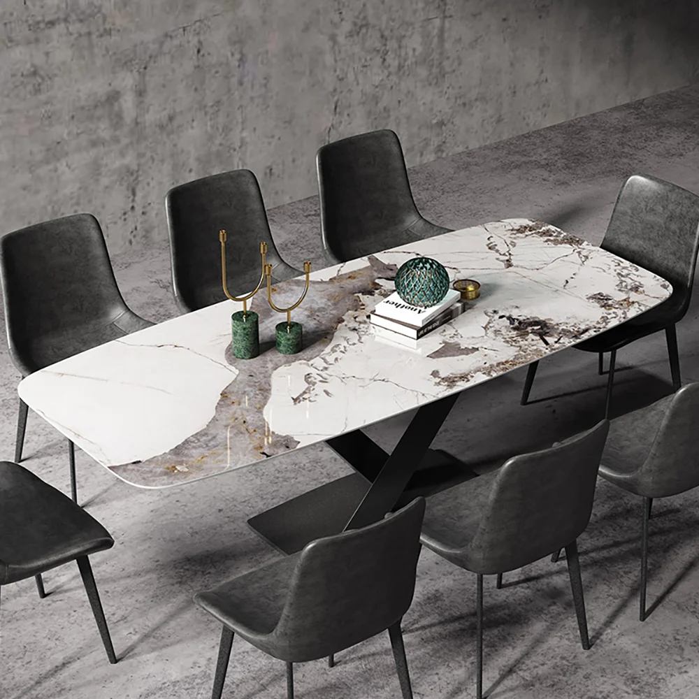 The charming dining table and chair set are compact yet stylish. It comfortably seats eight with the included solid wood, carbon steel, and leather chairs that are capped by comfortable upholstered seat cushions. The chic stone top dining table with a black base, around eight seats, this area will be the warm center of your house.