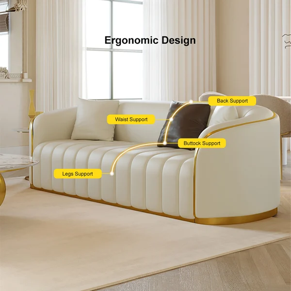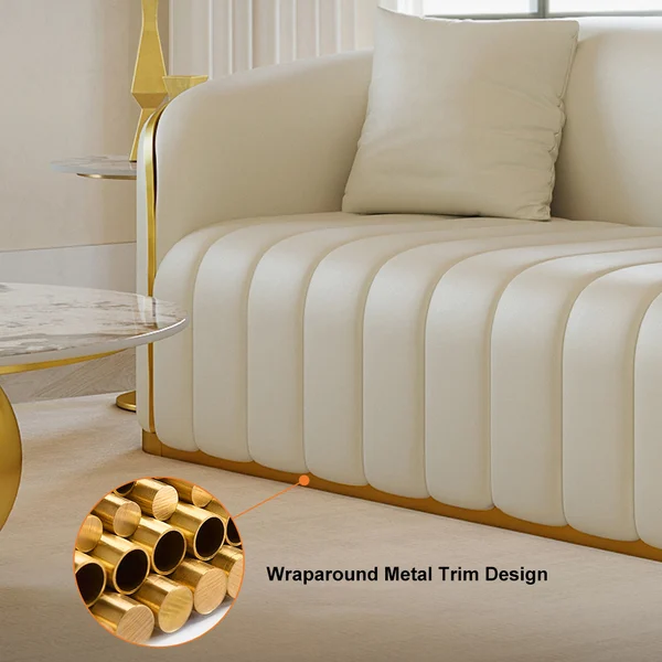 Elegant and stylish, this three-seater sofa will transform any living room into a luxurious lounge. Featuring soft tufting details, this sofa injects multifaceted texture into your overall design scheme. Faux leather upholstery and seating padding with high-density foam add maximum comfort for you when lounging after a long day. Come with a solid wood frame and gold stainless steel base, this sofa delivers sturdy support and durable performance. Lend a touch of luxury in your living room with this sofa.
