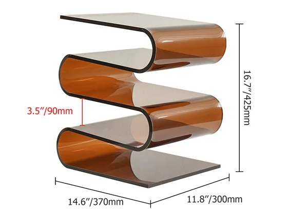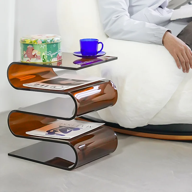 This end table made of brown acrylic has a curved shape. The compact desktop can hold coffee and snacks, This side table offers multiple storage locations for books and magazines. This side table can be used as a side table in the living room or as a nightstand in the bedroom. It can adapt to different scenes and saves space.