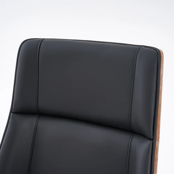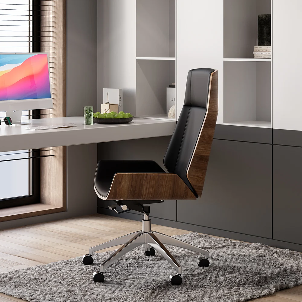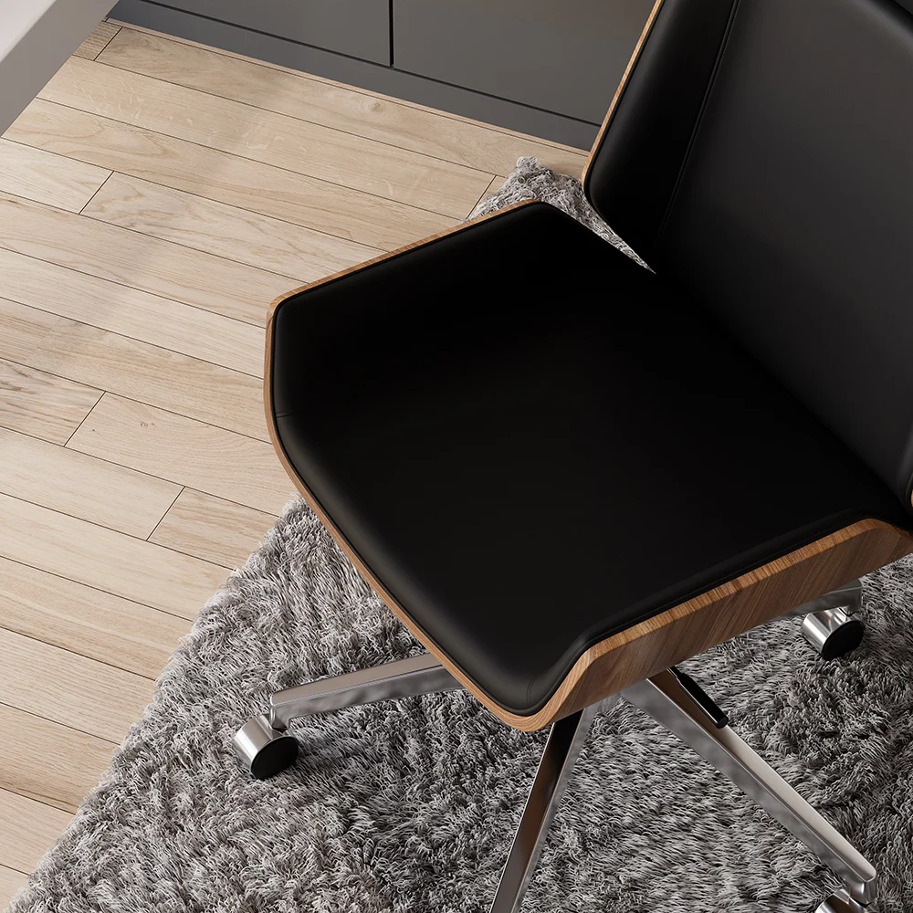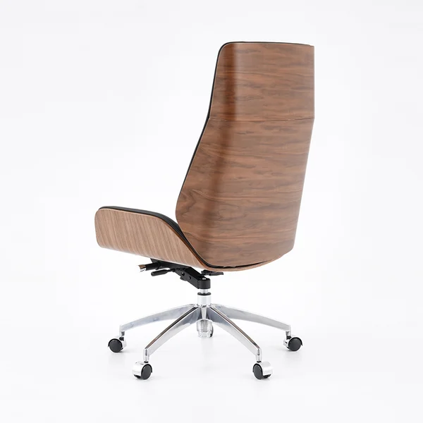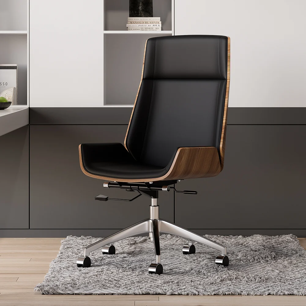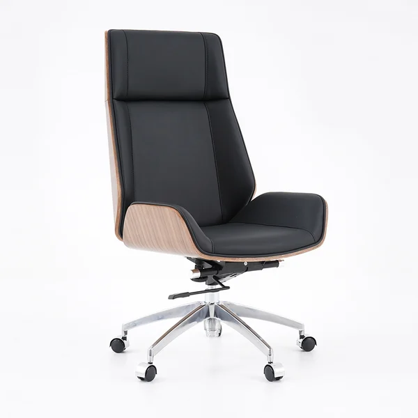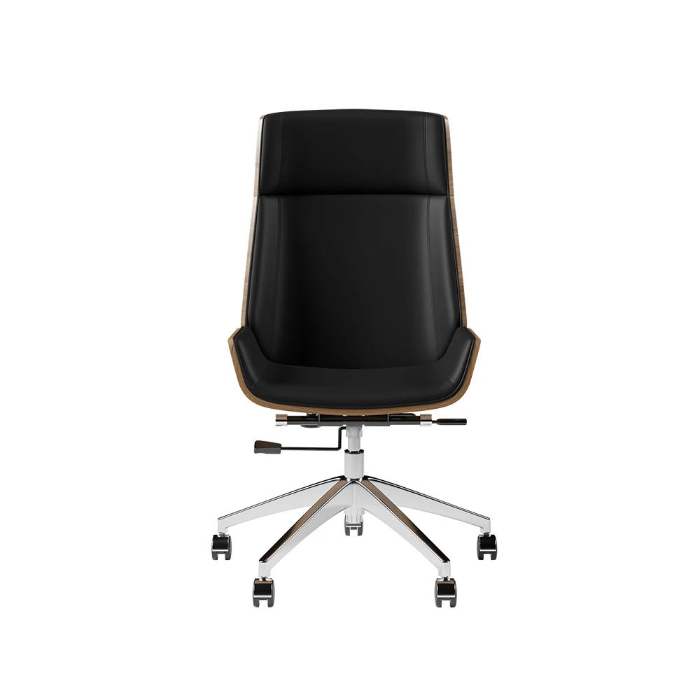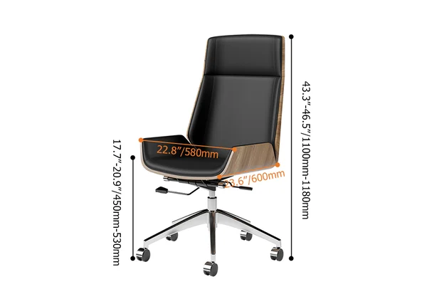 Get to work in a streamlined style with this executive office chair. Enveloped in eco-friendly faux leather upholstery accented by detail stitching, the cushioned seat features a full solid wood back, gently-flared arms, and a wide seat. Tilt control and a lever-operated pneumatic lift offer customized comfort, while an adjustable height design lets you arrive at your best position with ease. Rounding out the design, the gleaming stainless steel base ensures sturdy construction. Includes five hooded caster wheels for effortless mobility.