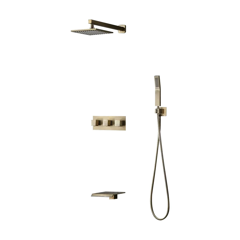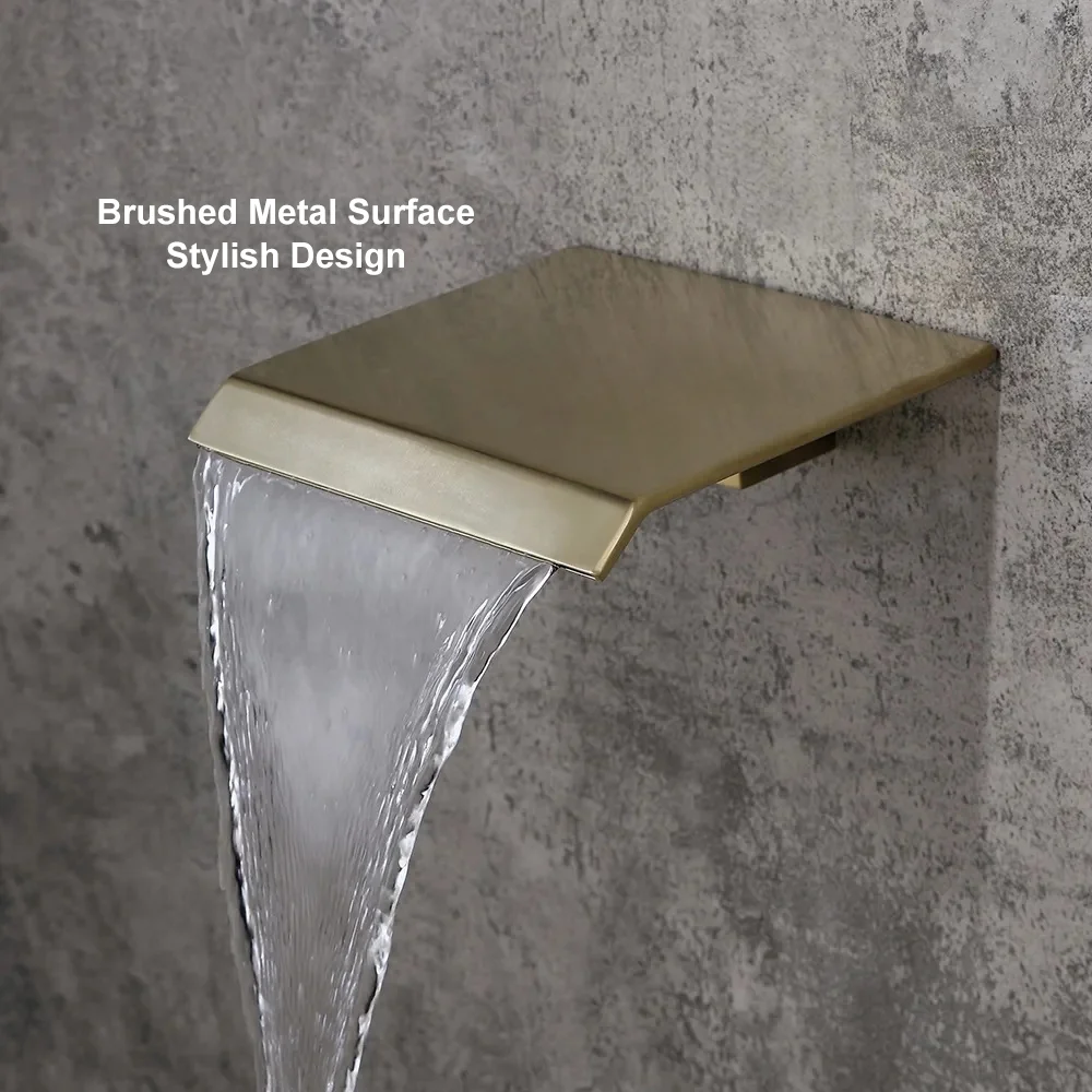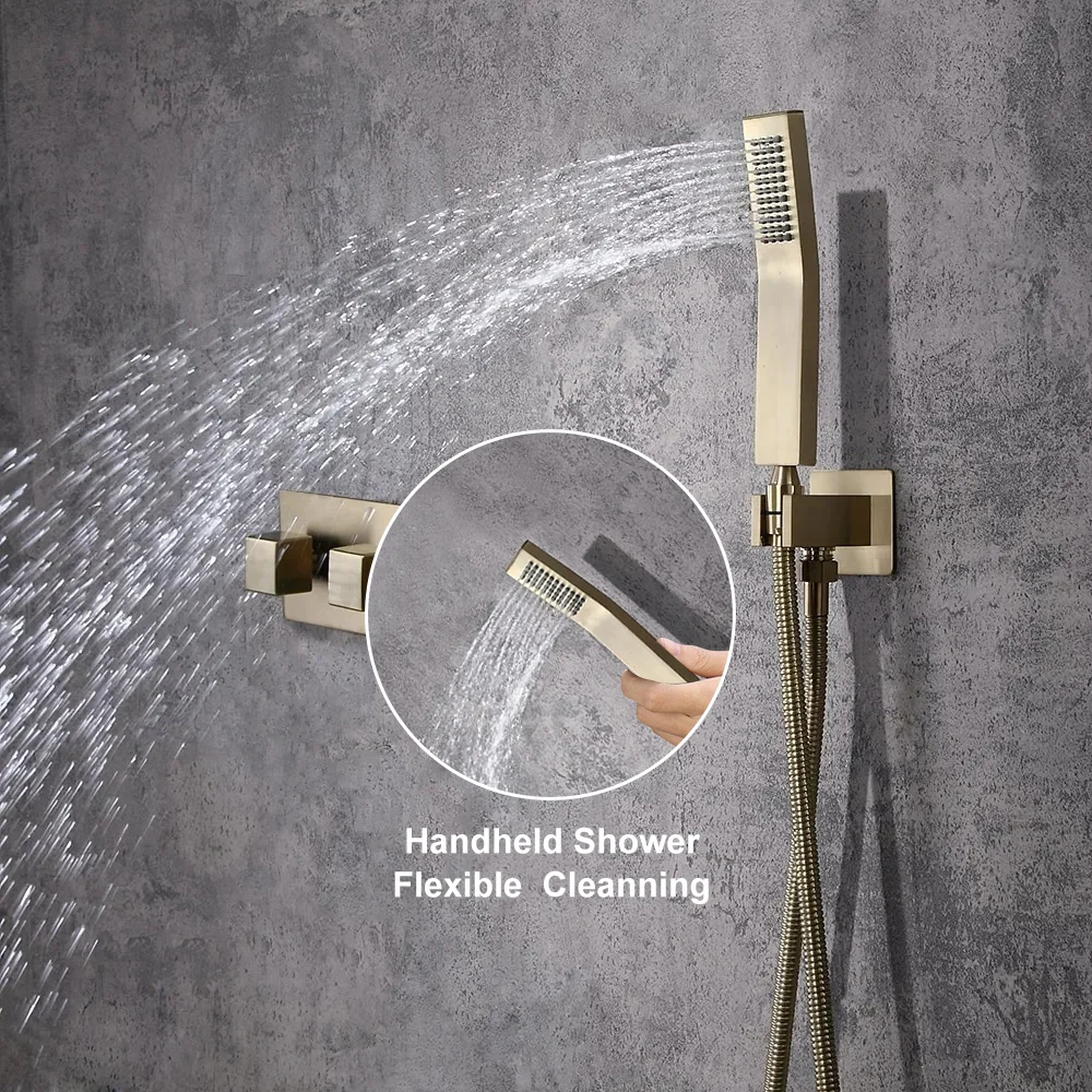 Transform your shower experience with this chic, stylish rainfall shower set. With simple, crisp lines and right angles, this rainfall shower set brings a luxurious modern charisma. Featuring a square rain shower head, it delivers a wide range of soft rain sprays to fresh your body and mind. The flexible hand shower allows you to take care of every inch of the body, and bathes your children and pets with great convenience. Enjoying a waterfall spout, water gently cascades into the tub quickly and creates amazing natural beauty. Constructed from solid brass with a refined finish, it assures timeless elegance through daily use. Perfect addition for your bathroom!