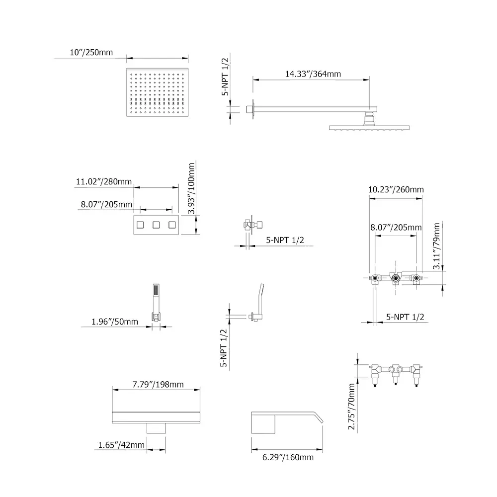 – Includes rain shower head, wall mount shower arm, hand shower parts, tub spout and 3-function mixer valve.