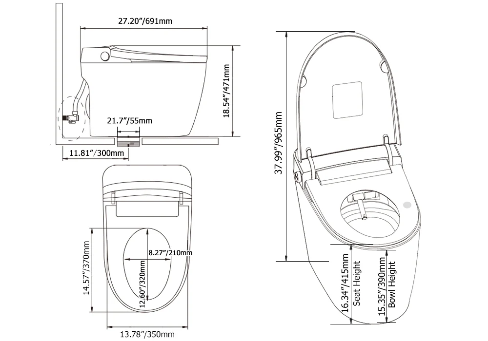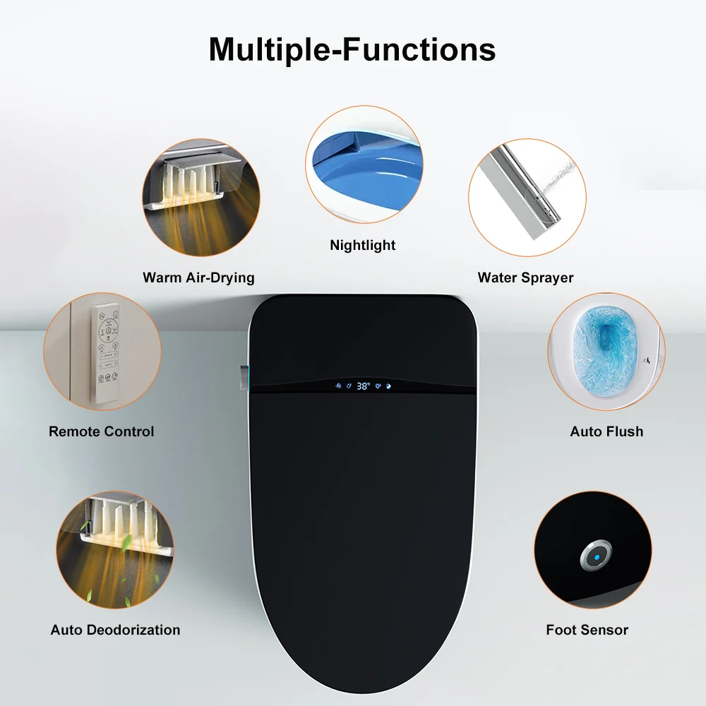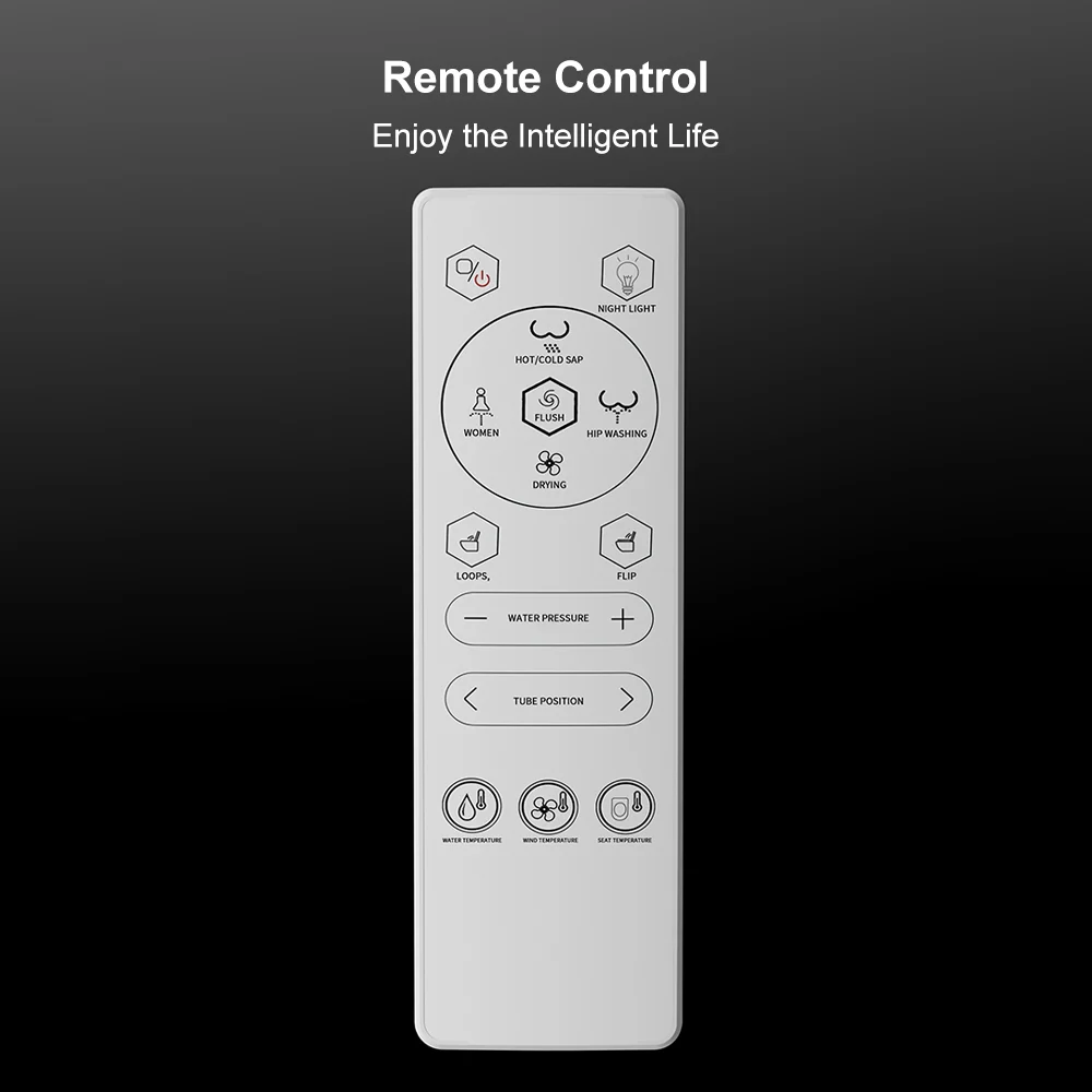 – Includes 1. Remote Control; 2. Automatic Open/Close; 3. Heated Seat; 4. Warm Wind Drying; 5. Water & Wind Temperature/Pressure Adjustment; 6.Rear Cleanse; 7. Menstrual Care; 8. Nozzle Self-cleaning; 9. Nozzle Adjustment; 10.Back-and-Forth Cleaning; 11.Night light; 12.Electric Leakage Protection; 13. Power-off Flush; 14.Safety Plug; 15.Instant heating; 16.Enema; 17.Anti-scald; 18.IPX4 Waterproof; 20.Pre-mist