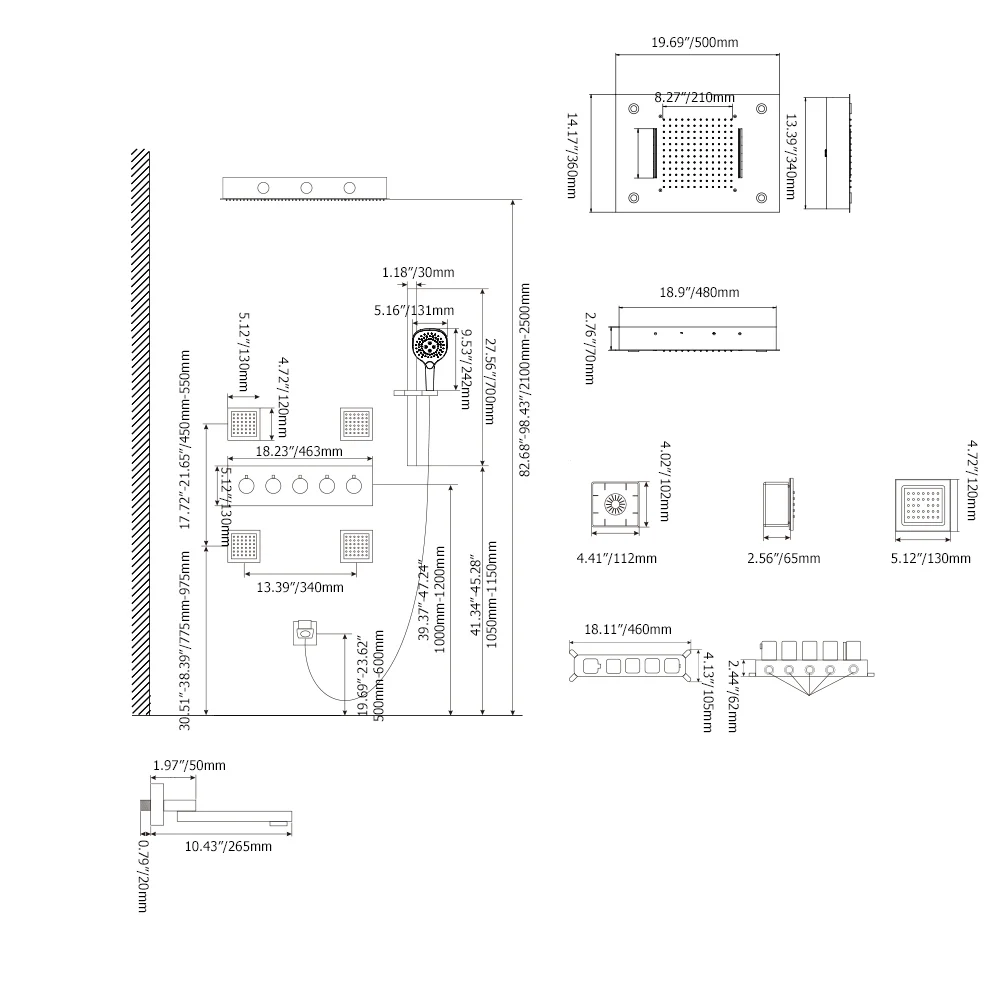 – Includes rain, waterfall & mist shower head, hand shower and 4-function shower mixer valve.