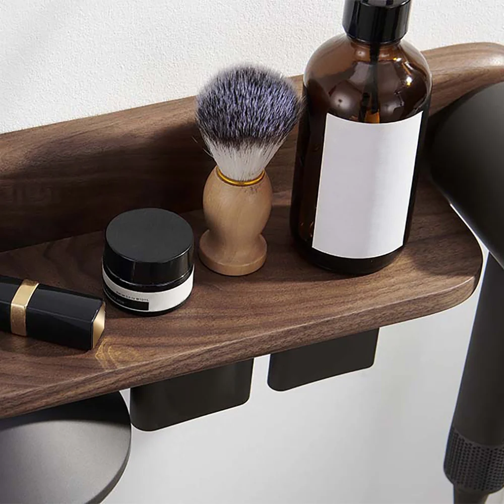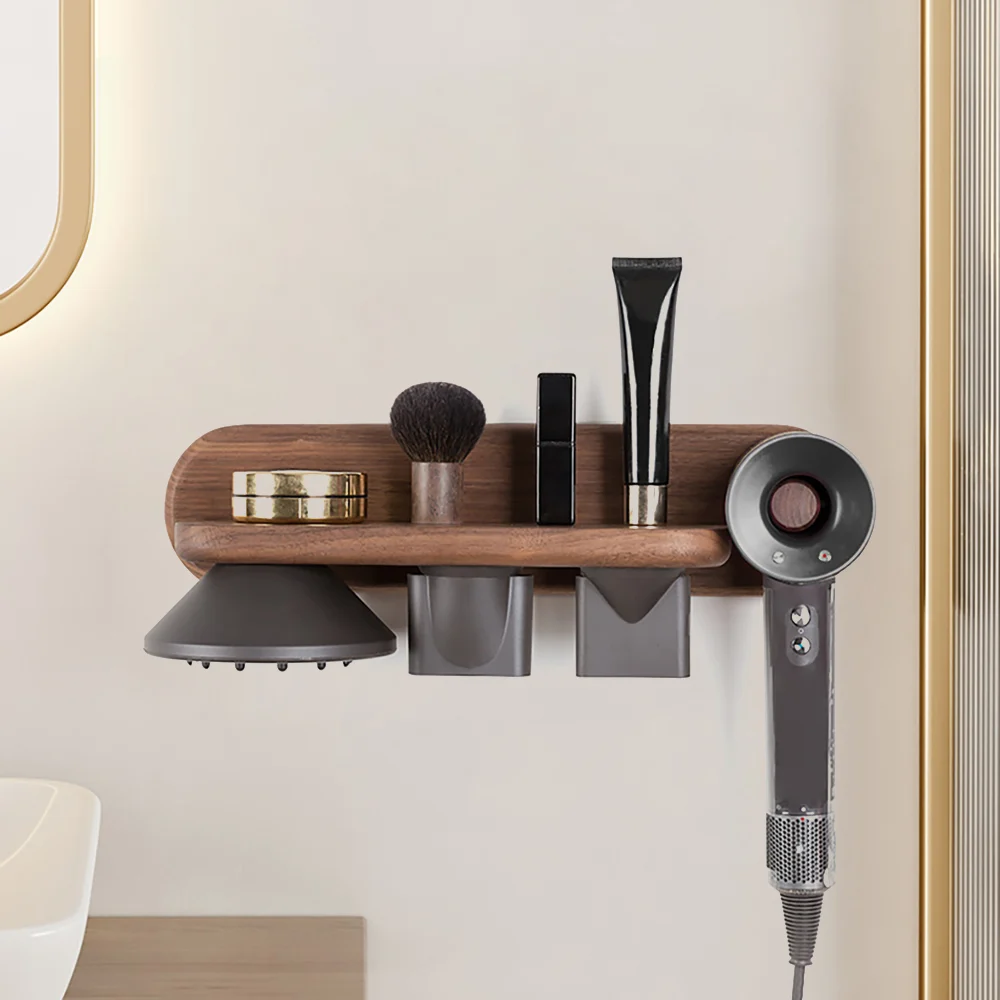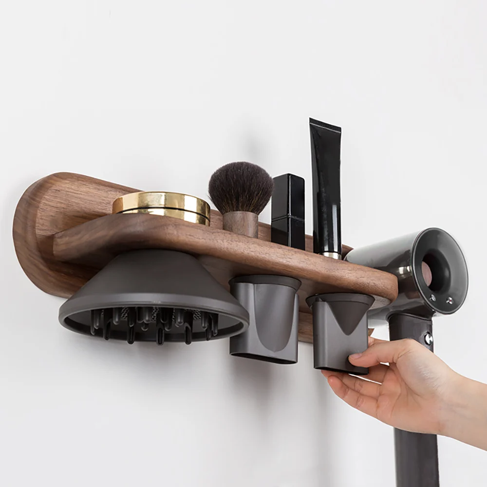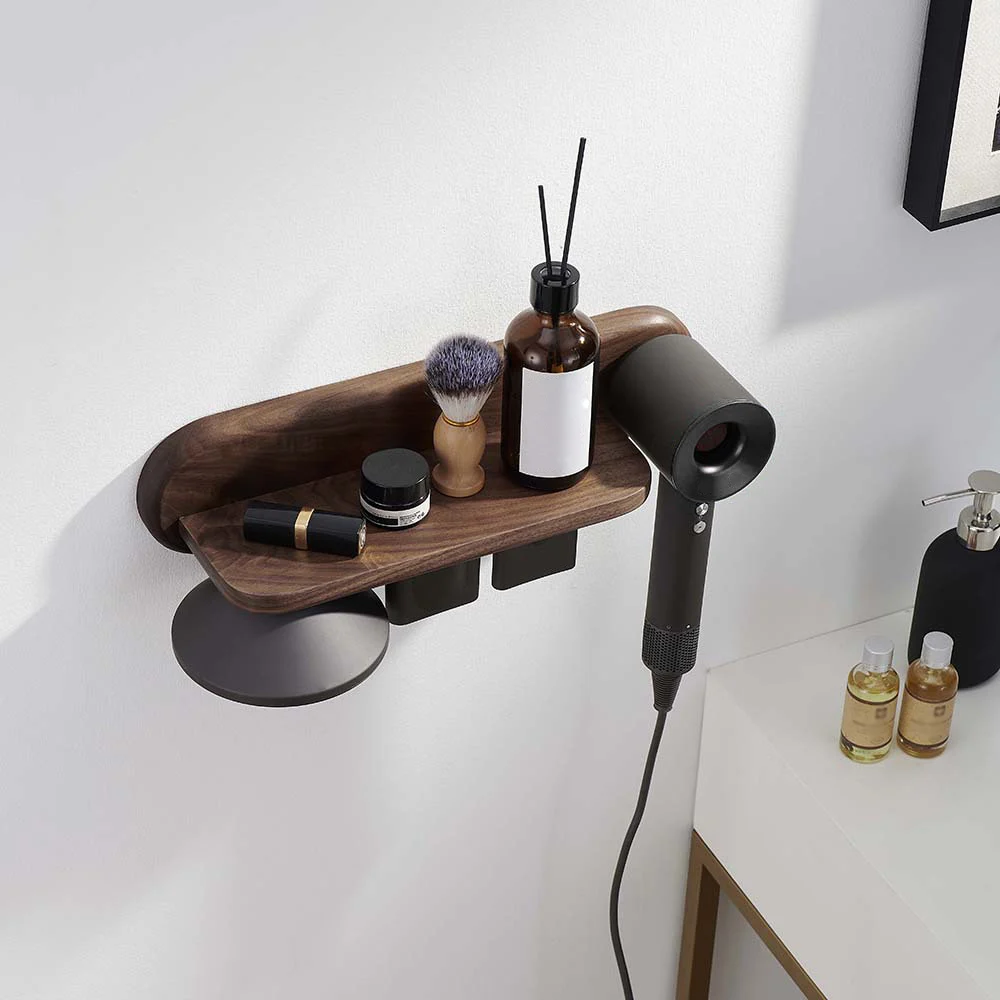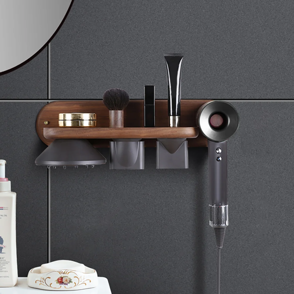 Wood Hair Dryer Holder Rack in Walnut with Accessories Storage & Shelf